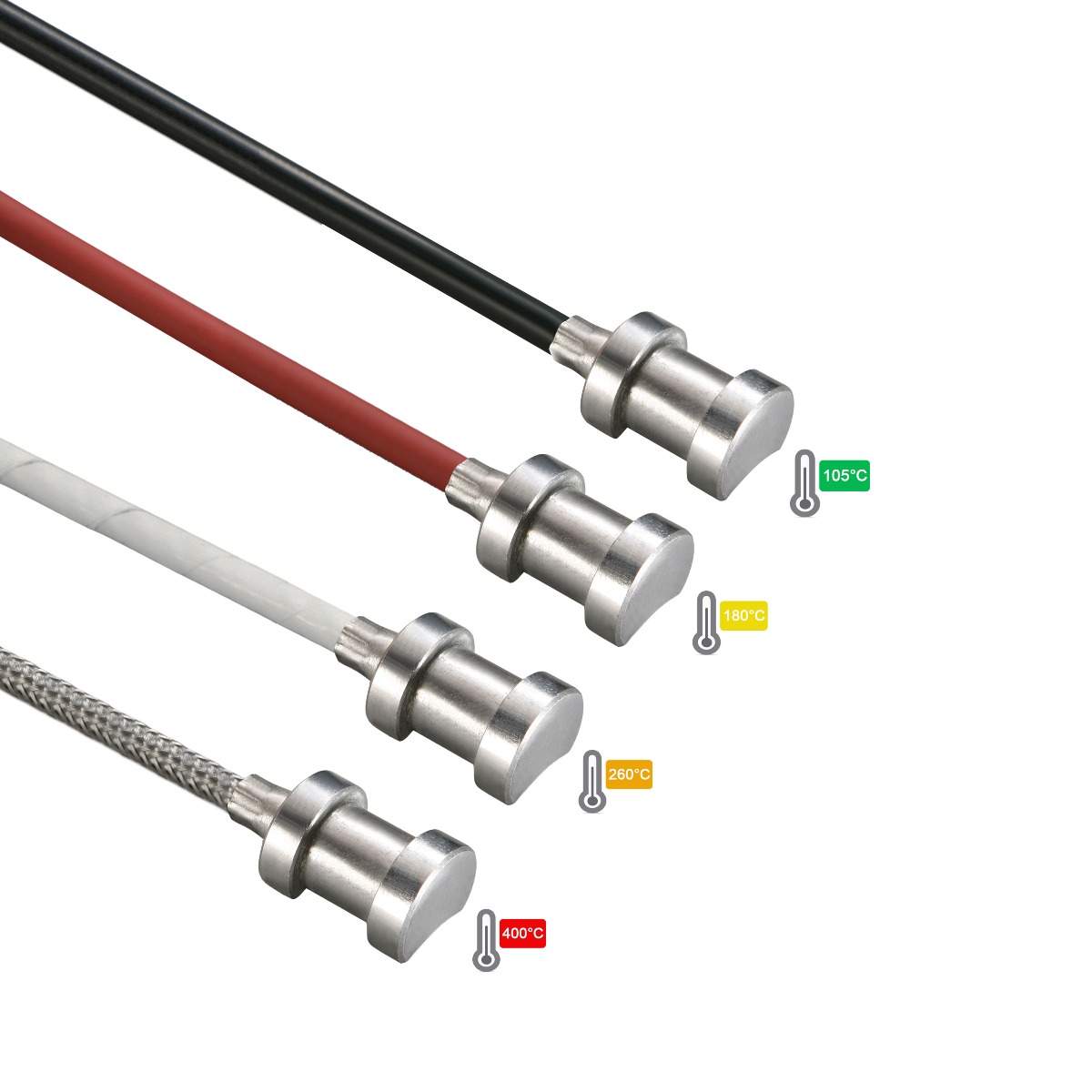| PVC = -40°C…+105°C; Silikon = -60°C…+180°C; PFA = -190°C…+260°C; Staklena vlakna = -60°C…+400°C |