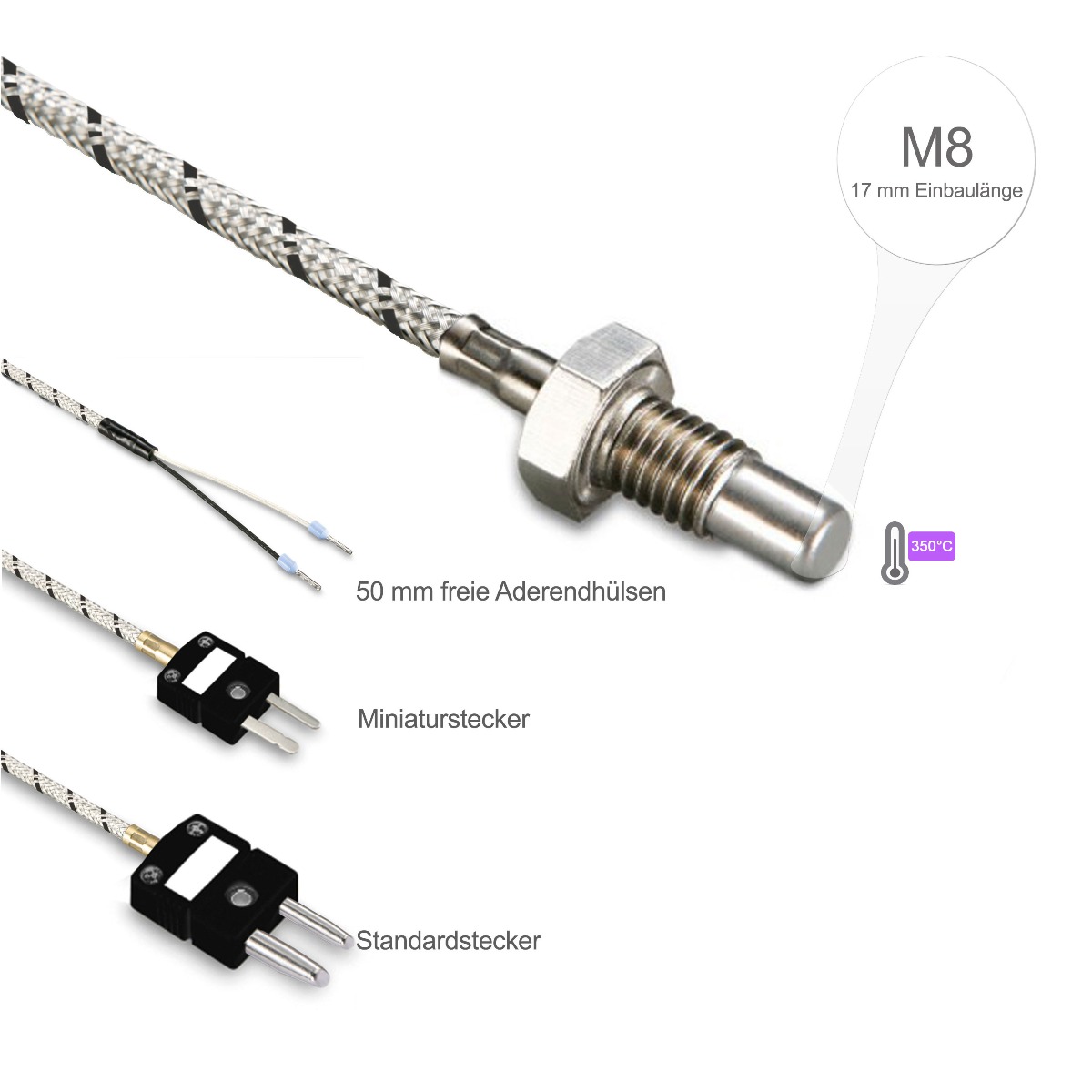 Naši uvrtni temperaturni senzori sa M8x1 finim navojem i 17 mm ugradne dužine sa FeCu-Ni tipa J koriste se za snimanje temperature tečnih i gasovitih medija. Naši senzori koji se uvijaju koriste zaštitnu navlaku od nerđajućeg čelika, koja idealno štiti stvarni temperaturni senzor od uticaja okoline i mehaničkog stresa, nudeći na taj način optimalna svojstva za širok spektar lokacija. Uvrtni senzor se uvrće direktno u posudu ili cevovod medijuma koji se meri. Takođe se može progurati kroz rupu i fiksirati pomoću matice.