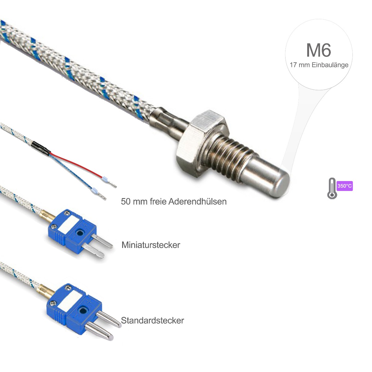 Naši uvrtni temperaturni senzori sa navojem M6x1 i ugradnom dužinom od 17 mm sa FeCu-Ni tipa L koriste se za snimanje temperature tečnih i gasovitih medija. Naši senzori koji se uvijaju koriste zaštitnu navlaku od nerđajućeg čelika, koja idealno štiti stvarni temperaturni senzor od uticaja okoline i mehaničkog stresa, nudeći na taj način optimalna svojstva za širok spektar lokacija. Uvrtni senzor se uvrće direktno u posudu ili cevovod medijuma koji se meri. Takođe može da se progura kroz rupu i fiksira pomoću matice.