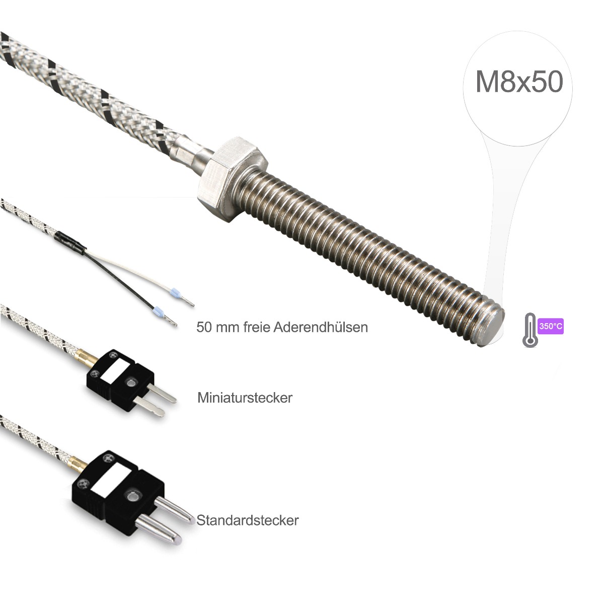 Naši uvrtni temperaturni senzori sa navojem M8x50 sa FeCu-Ni tipa J koriste se za snimanje temperature tečnih i gasovitih medija. Naši senzori koji se uvijaju koriste zaštitnu navlaku od nerđajućeg čelika, koja idealno štiti stvarni temperaturni senzor od uticaja okoline i mehaničkog stresa, nudeći na taj način optimalna svojstva za širok spektar lokacija. Uvrtni senzor se ušrafi direktno u posudu ili cevovod medijuma koji se meri. Takođe se može progurati kroz rupu i fiksirati pomoću matice.