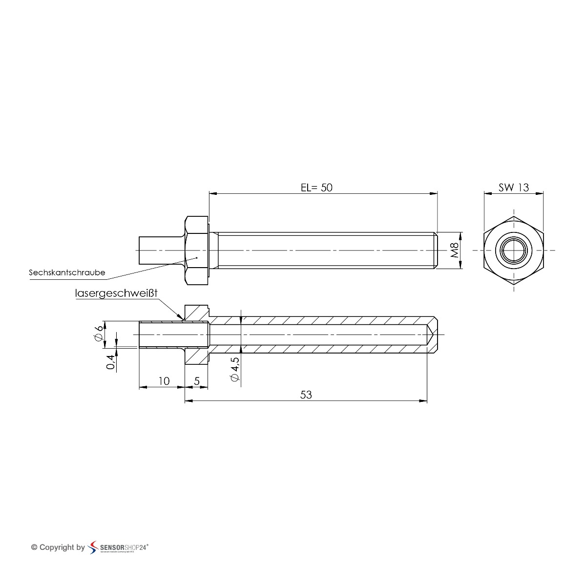 Naši uvrtni temperaturni senzori sa navojem M8x50 sa NiCr-Ni tipa K se koriste za beleženje temperature tečnih i gasovitih medija. Naši senzori koji se uvijaju koriste zaštitnu navlaku od nerđajućeg čelika, koja idealno štiti stvarni temperaturni senzor od uticaja okoline i mehaničkog stresa, nudeći na taj način optimalna svojstva za širok spektar lokacija. Uvrtni senzor se uvrće direktno u posudu ili cevovod medijuma koji se meri. Takođe se može progurati kroz rupu i fiksirati pomoću matice.